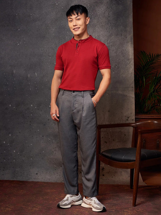 LooFoN Slim Fit Men's Mandarin collar Maroon T-Shirt